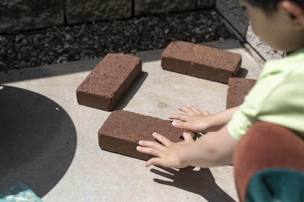 長男にとっては、レンガも立派な“遊び道具”。積んで、ずらして、また戻して。