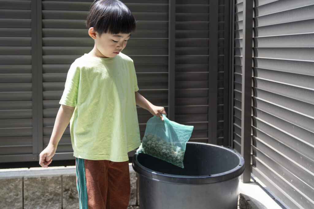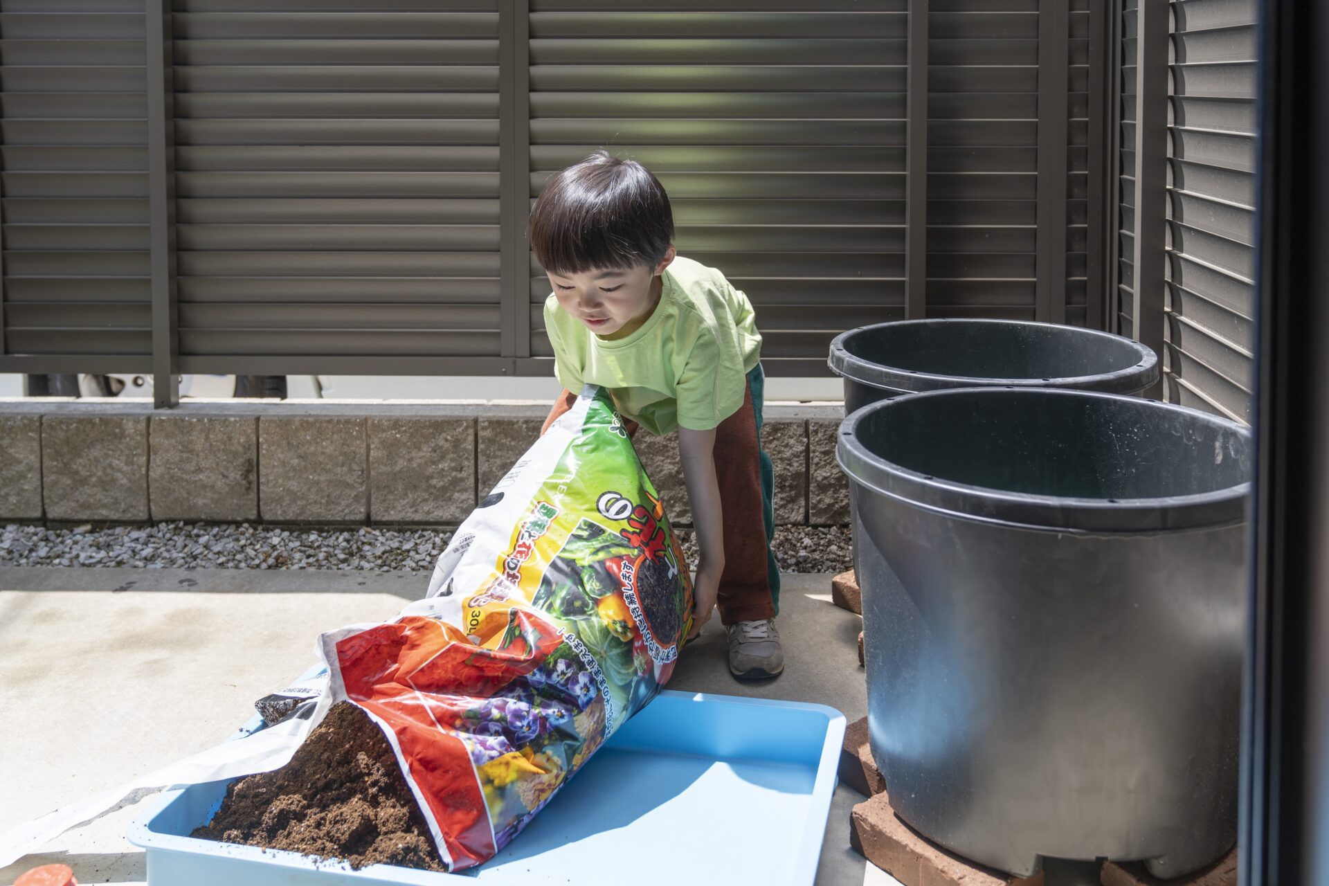 まずは長男と一緒に、“ベランダの畝づくり”に取りかかる。もちろん、土を掘るわけではない。