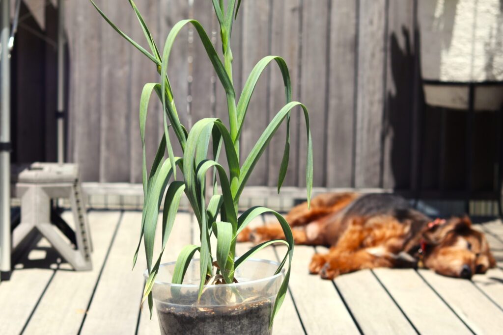 ベランダのプランターやキッチンに置いたコップから、葉がにょきにょき伸びてくる姿は見ていてワクワクします。我が家の愛犬も、葉にんにくを眺めながらお昼寝を楽しんでいます(笑)。