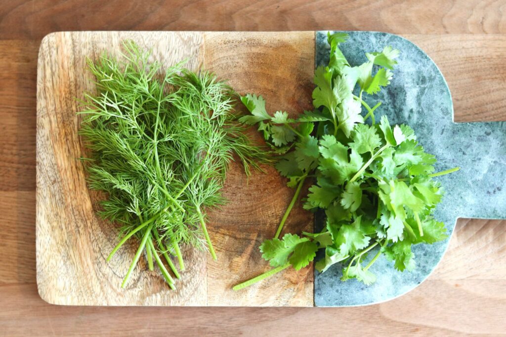 ひと枝のハーブが旅するように3皿を巡る、桑折さんならではの“香りの旅”。ディルは冷涼な気候を好み、発芽までは乾燥を防ぎつつ明るい場所で管理しましょう。パクチーは暑さに弱いため、夏場は半日陰で育てるのがコツ。