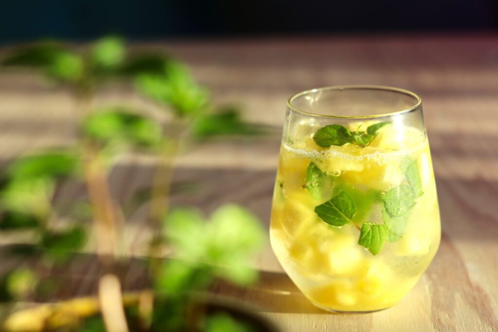 スペアミントは葉が柔らかく、香りがまろやか。摘み取るたびに新芽が伸びるので、パーティー前日から数枚ずつ収穫しておくと便利です。パイナップルの甘みとライムの酸味がミントの清涼感を引き立て、ノンアルでも華やかな一杯に。透明グラスに注げば、緑が光を受けてテーブルが一瞬で華やぎます。