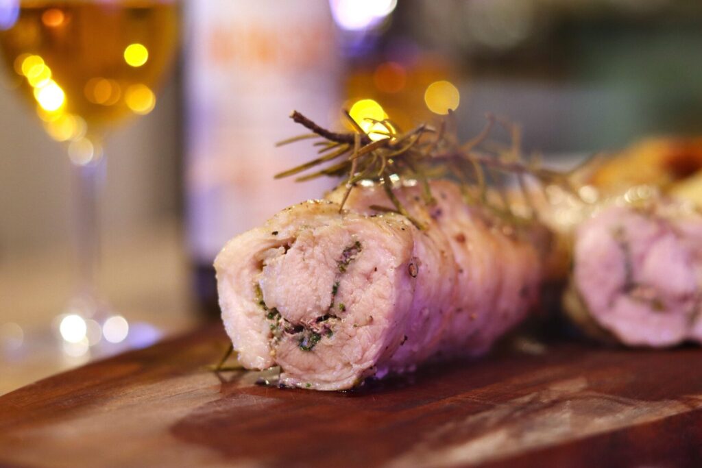 「前日または当日の午前中に、豚バラ肉の塊に塩と刻んだにんにく、ハーブ類(セージ、イタリアンパセリ、オレガノなど)を刷り込んで巻き、タコ糸で縛っておきます。お客様が来たら、オリーブオイルをローズマリーの枝で表面に塗り、オーブンで焼くだけで立派なメイン料理の完成です」。