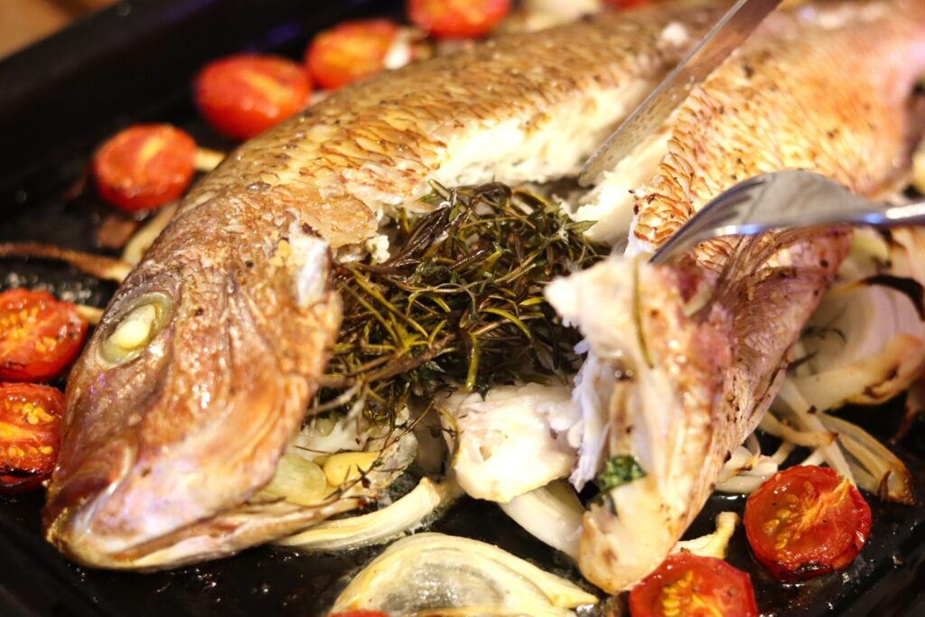 「ローズマリーやタイムを魚のお腹に詰めて、塩とオリーブオイルでマリネしてオーブンで焼きます。