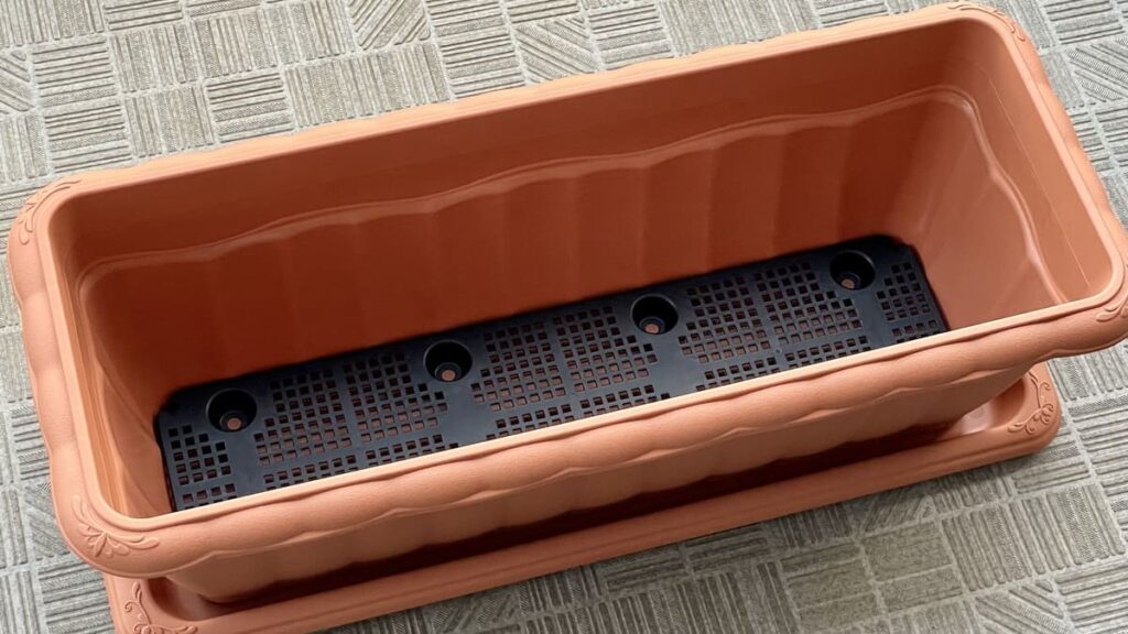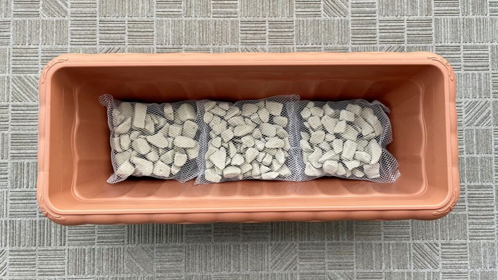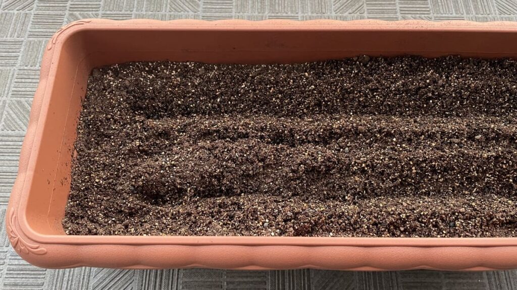 春と秋がからし菜の種まきに適した時期です。まずはプランターに鉢底ネットと鉢底石を敷き、野菜用培養土を入れて表面を平らに整えましょう。